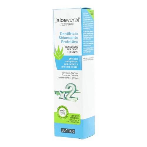 [ALOEVERA]2 Dentifricio Sbiancante Protettivo Il dentifricio Sbiancante Protettivo svolge un’azione anti-placca, anti-tartaro e offre un alito più fresco. Con Olio di Neem e Lichene islandico per l’effetto sbiancante, con Clorofilla e Rosmarino rinfrescanti dell’alito. Inoltre, contiene Tea Tree ed Echinacea contro placca e tartaro, Vitamine A, C e P.