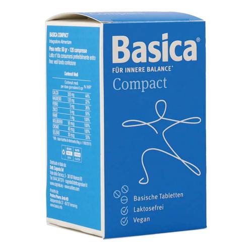 Indicazione per diabetici: una porzione giornaliera (6 compresse) di Basica Compact corrisponde a <0,5 UP o 25 kJ (6 kcal).