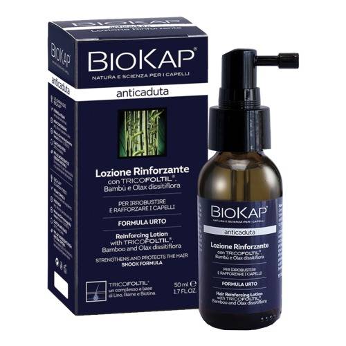 Formula cosmetica rinforzante a base di Tricofoltil (complesso a base di Olio di Lino, Rame e Biotina), estratto da Olax dissitiflora, con China, Capsico, Achillea, Ortica, Vite Rossa bio, semi di Zucca, Saw Palmetto e oli essenziali bio di Rosmarino e Melaleuca per irrobustire e rafforzare i capelli.