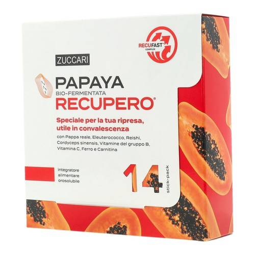 integratore alimentare a base di polpa di Carica papaya biofermentata, atomizzata e granulata con naturali proprietà antiossidanti. Papaya Recupero è ideale nei periodi di debolezza, spossatezza e quindi utile anche nei periodi di convalescenza. La papaya bio-fermentata zuccari è resa speciale da Recufast Complex, un mix di attivi per un pronto e pieno recupero: eleuterococco tonico-adattogeno, cordyceps sinensis per l'azione tonica e di sostegno metabolico, ferro e vitamine del gruppo B per ridurre stanchezza e affaticamento oltre a vitamina C che contribuisce al normale metabolismo energetico e accresce l'assorbimento del ferro. L'esclusivo mix è reso completo da pappa reale, reishi e carnitina.